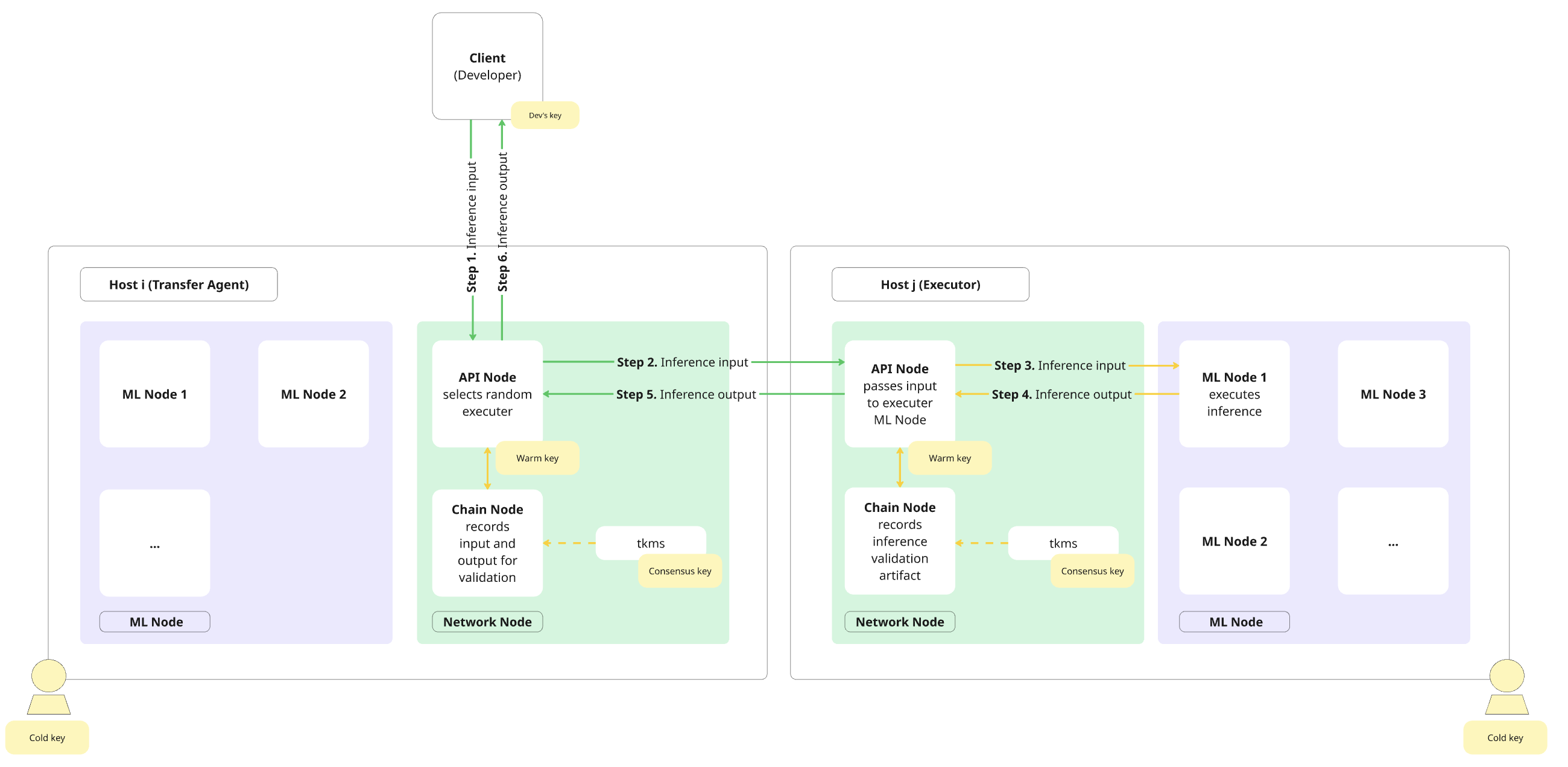 - Step 1. A Client (Developer) selects a random node from the list of active participants (Hosts). This random Host acts as the Transfer Agent (TA) and gets an inference request to its API node. Any Host acts as Validator, TA and an Executor (these are not predefined or on-chain roles, but dynamic operational functions assumed when processing a request).