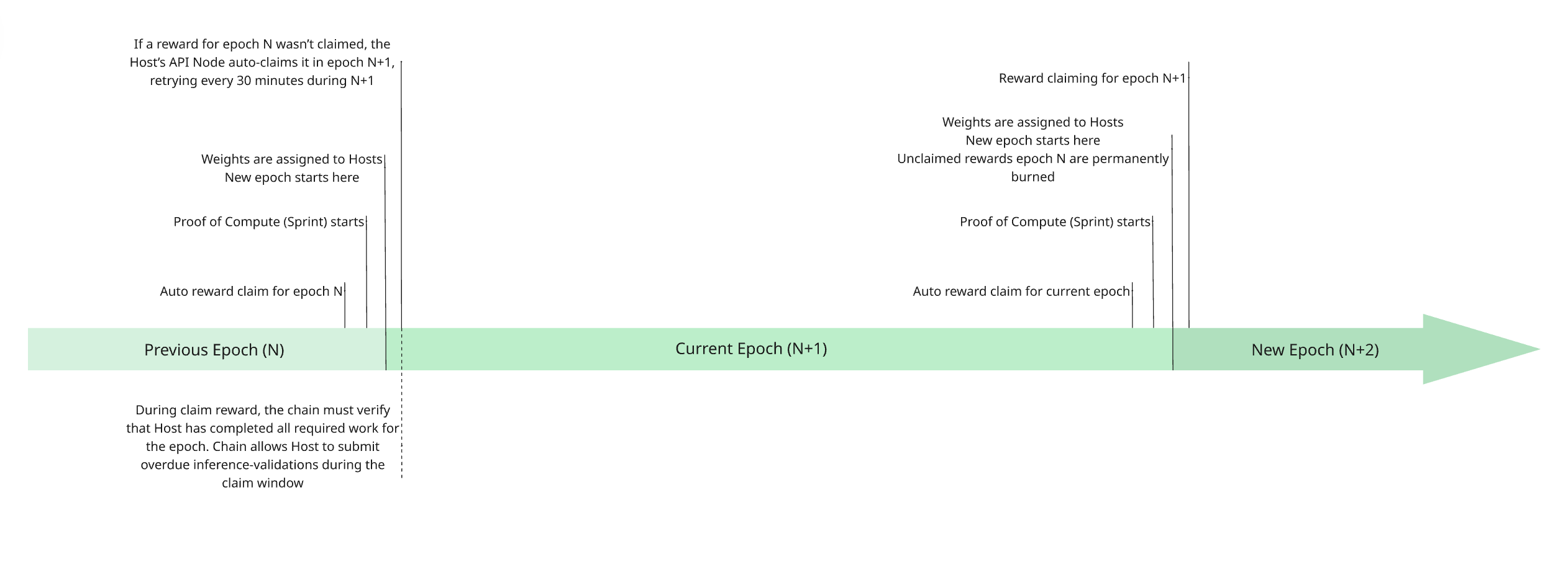 As part of the claim process, the chain verifies that Host completed all required work for the epoch. The protocol also allows overdue inference-validation artifacts to be submitted during this window, giving Hosts a final opportunity to execute any pending validations before rewards are finalized.