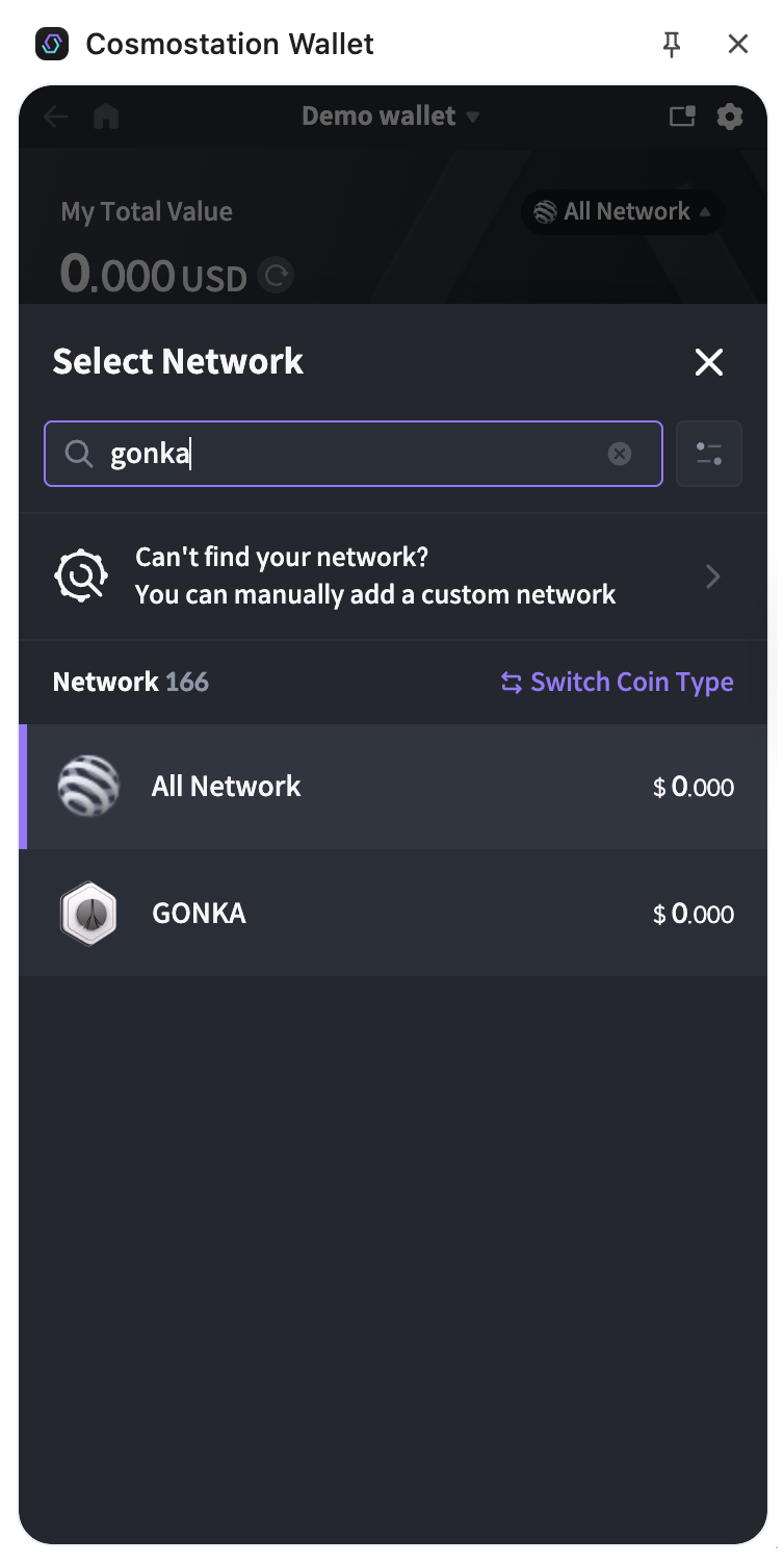In the top-right corner, click “All Networks” and select the Gonka chain to add it to your wallet.
