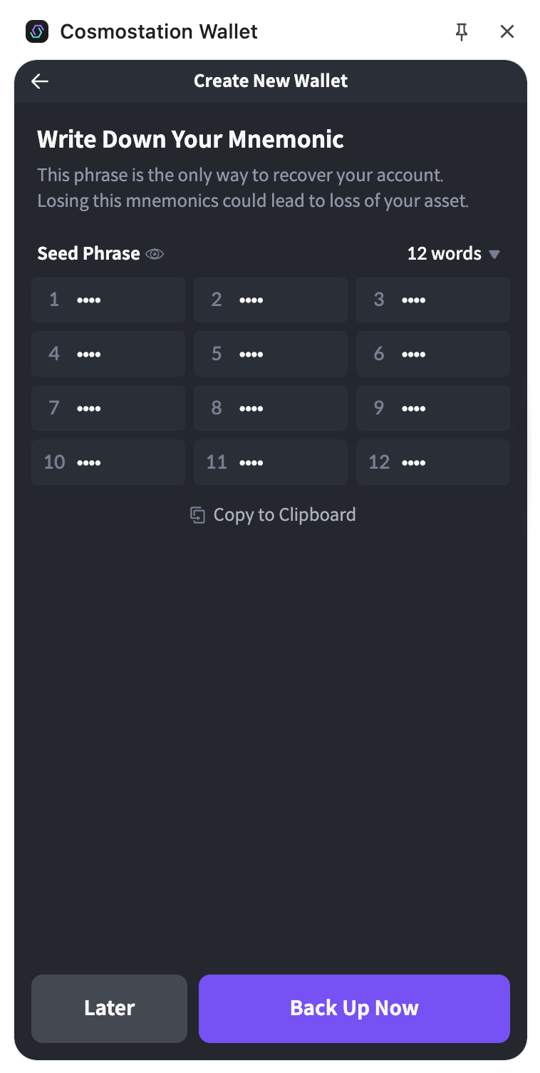 Write down your mnemonic phrase. DO NOT share your recovery phrase with ANYONE. Anyone with your recovery phrase can have full control over your assets. Please stay vigilant against phishing attacks at all times. Back up the phrase safely.