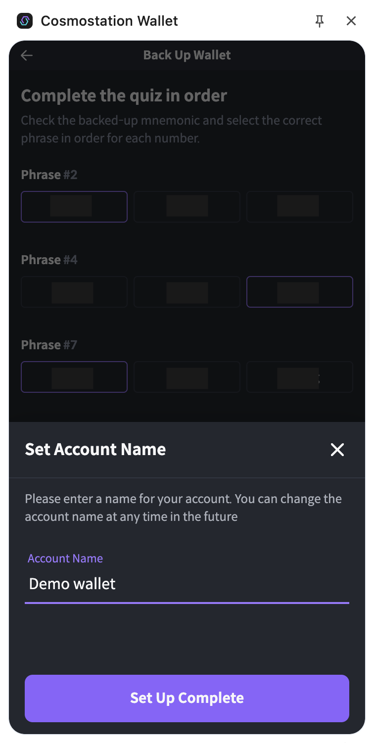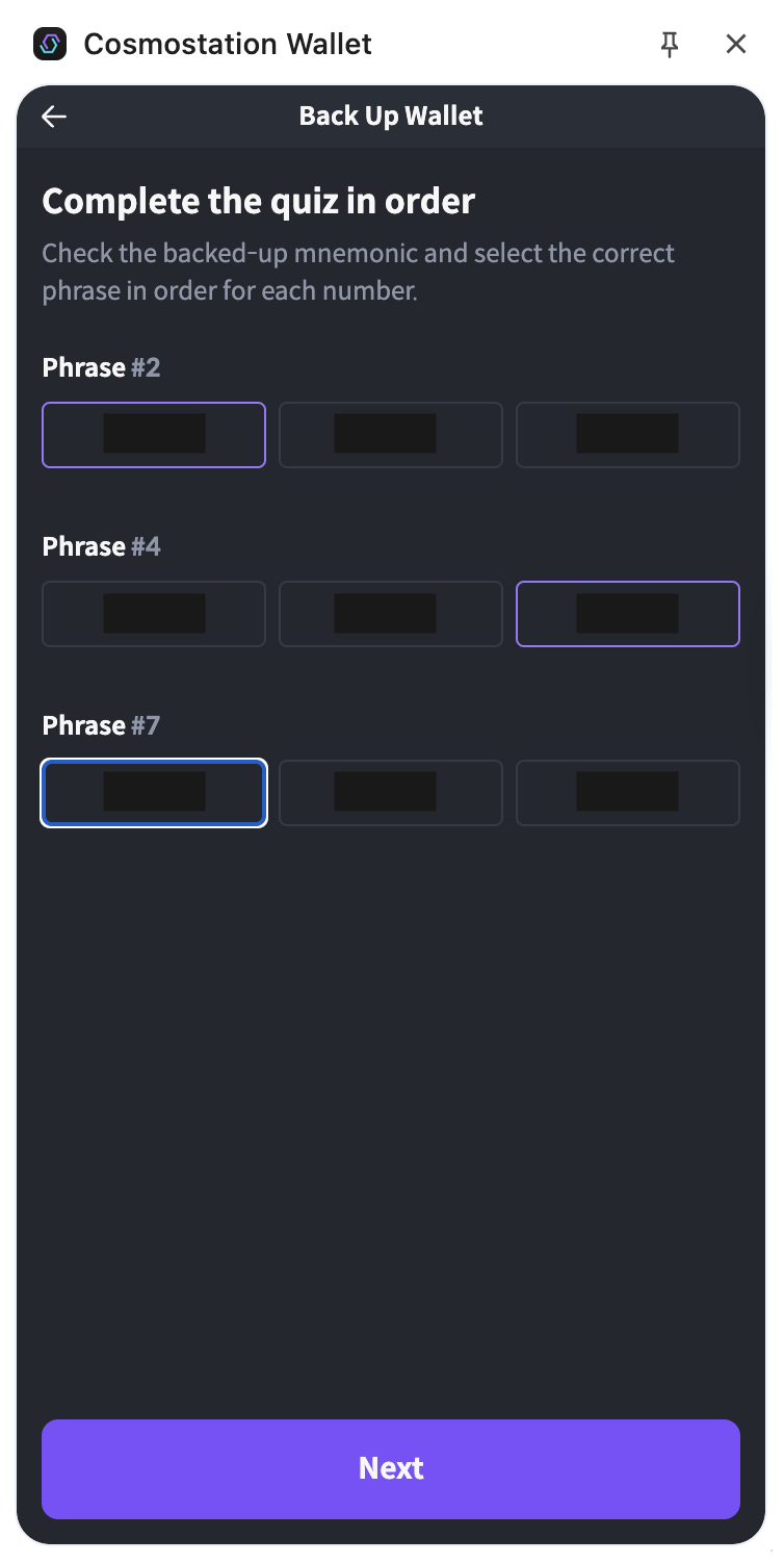 Complete the quiz in order. Check the backed-up mnemonic and select the correct phrase in order for each number.