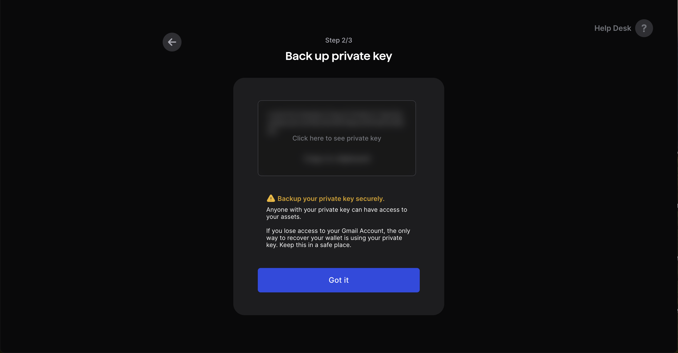 Backup your private key securely. Anyone with your private key can have access to your assets. If you lose access to your Gmail Account, the only way to recover your wallet is using your private key. Keep this in a safe place.