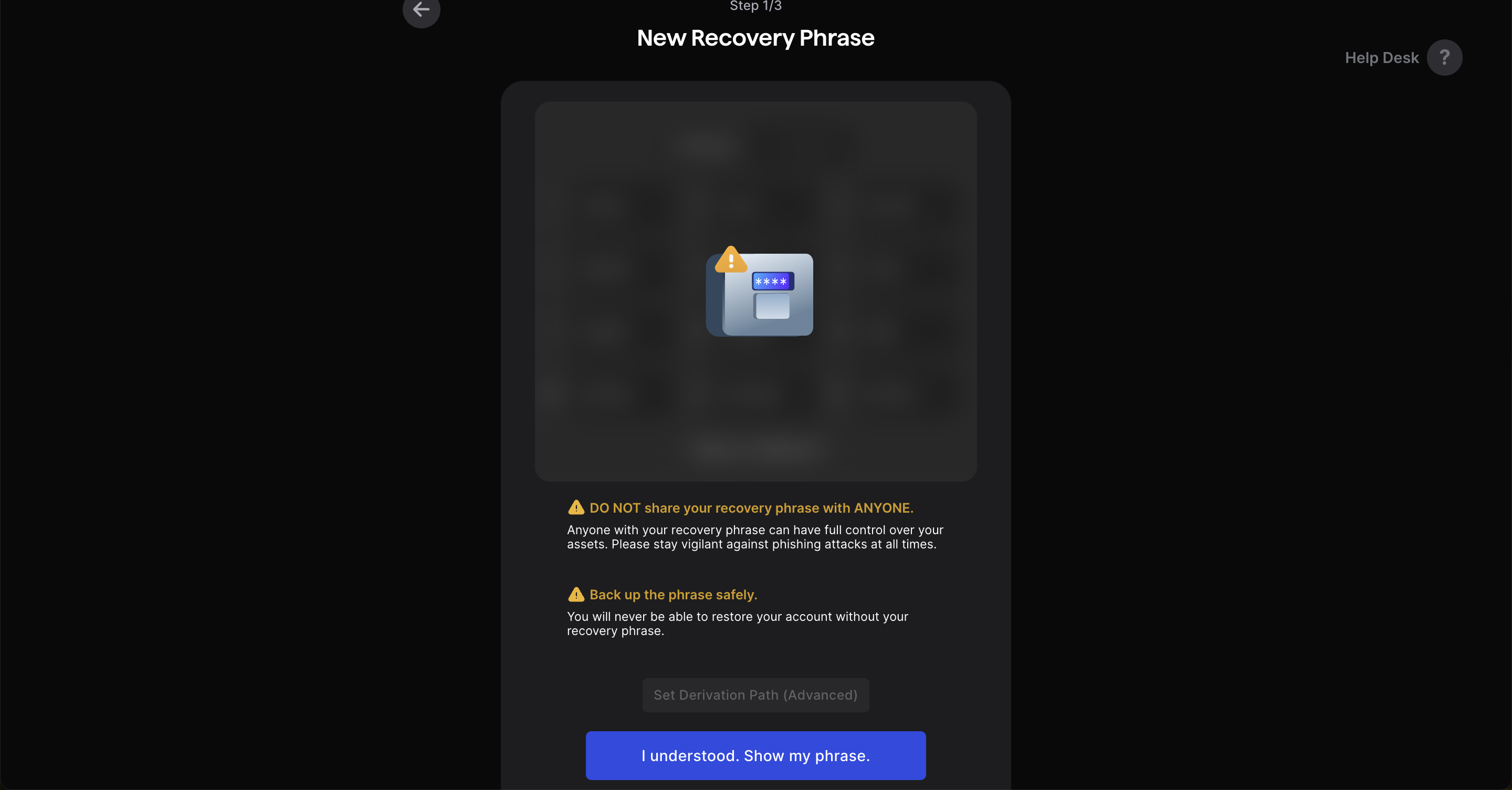 DO NOT share your recovery phrase with ANYONE. Anyone with your recovery phrase can have full control over your assets. Please stay vigilant against phishing attacks at all times. Back up the phrase safely. You will never be able to restore your account without your recovery phrase.