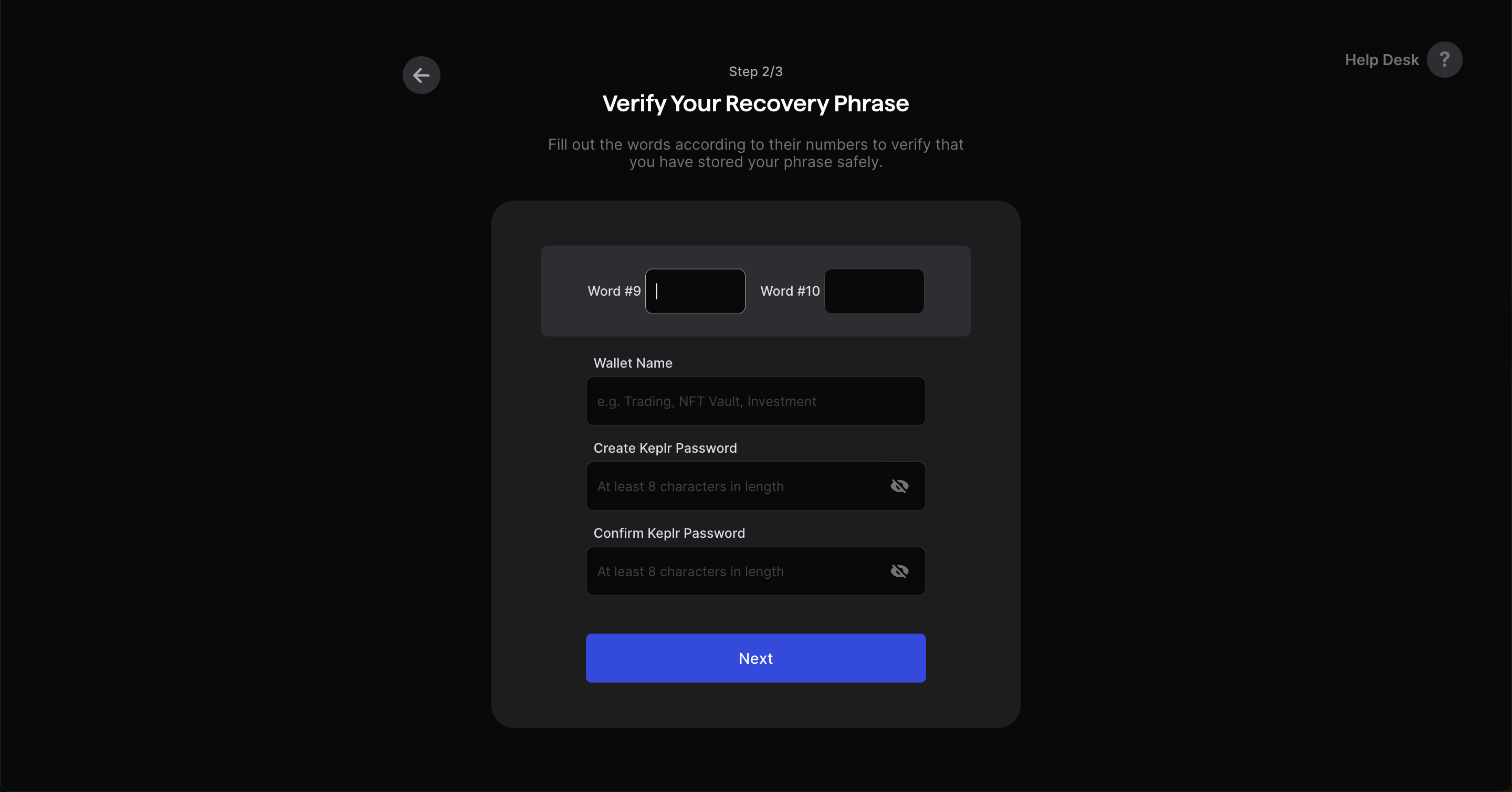 Verify your recovery phrase, create wallet name and password.