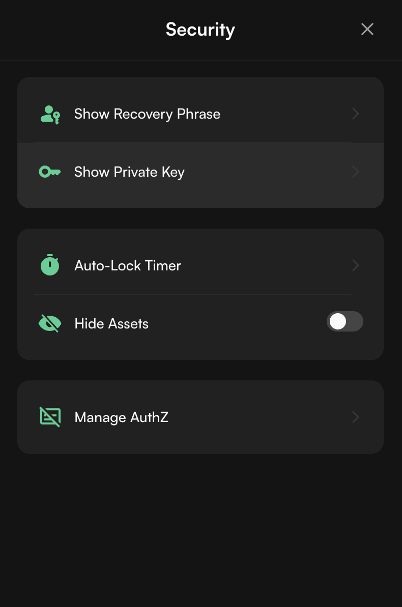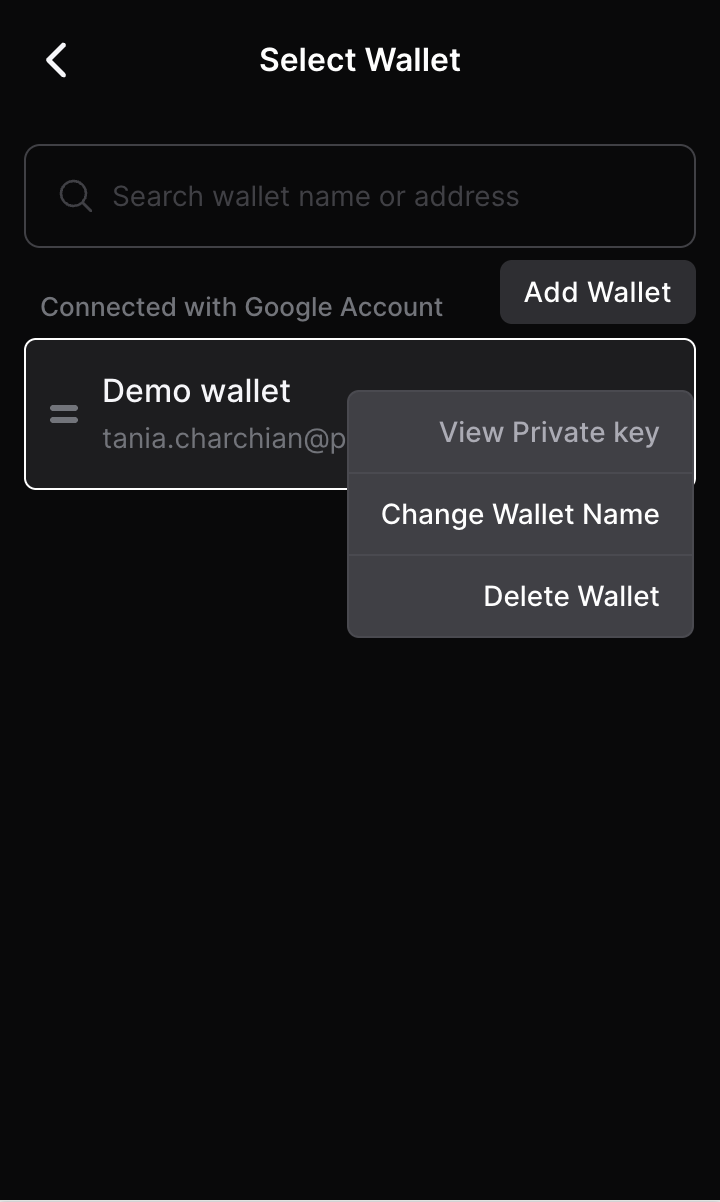 Navigate three dots and click "View private key" if you "connected with Google" or "View recovery phrase" if you created an account using a "recovery phrase".