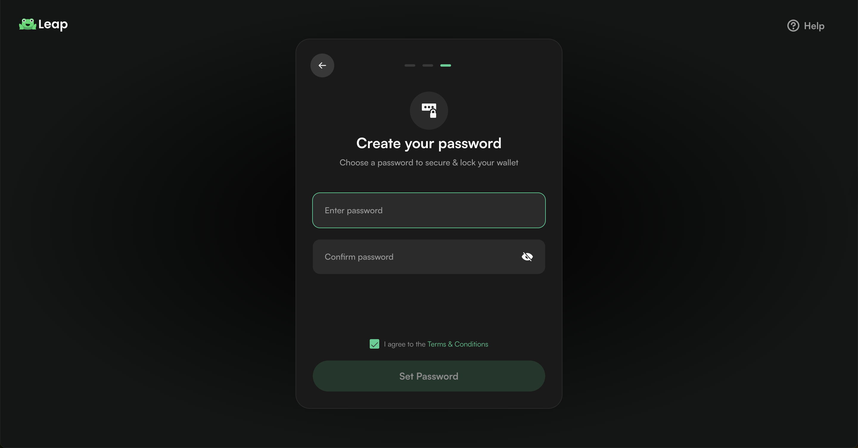 Choose a password to secure & lock your wallet. Agree to the Terms & Conditions.