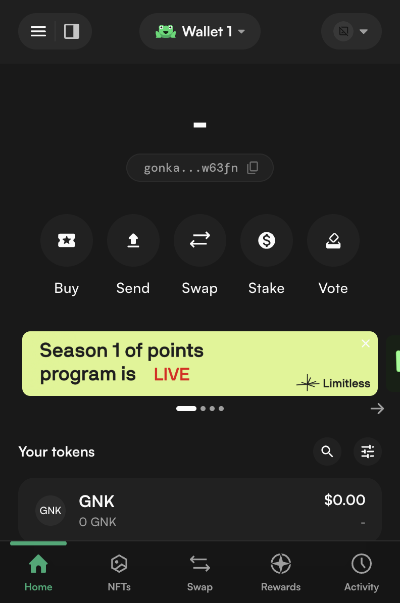 Done — your Gonka account has been successfully imported into Leap wallet (click on the frog icon and wallet name in the top center button to switch between wallets).