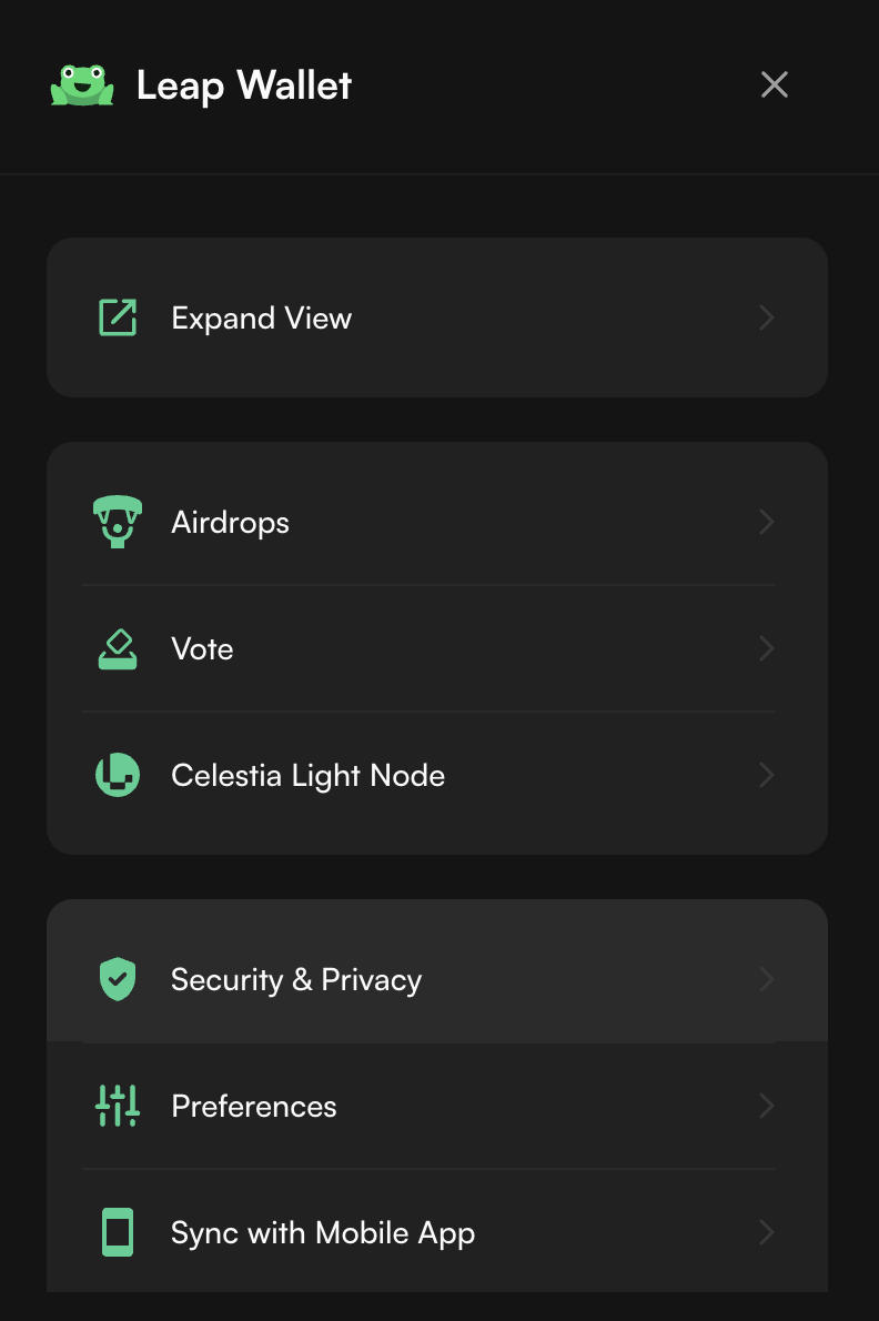 Open the extension and click on the frog icon and wallet name in the top center button of the extension window.