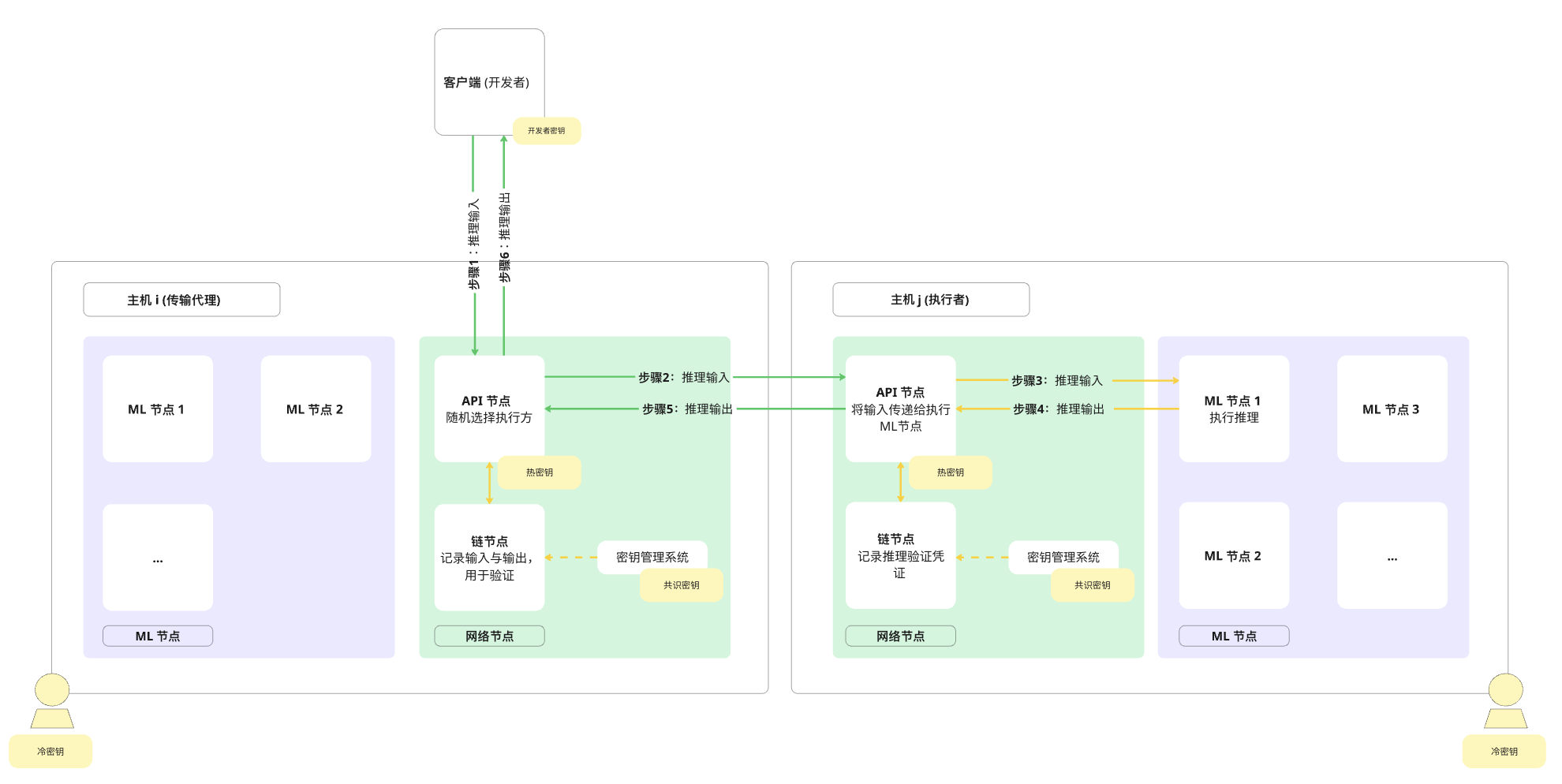 下面的图表显示了推理请求通过 Gonka 网络的流程。绿色箭头表示通过公共互联网的通信,黄色箭头表示主机私有网络内的通信。