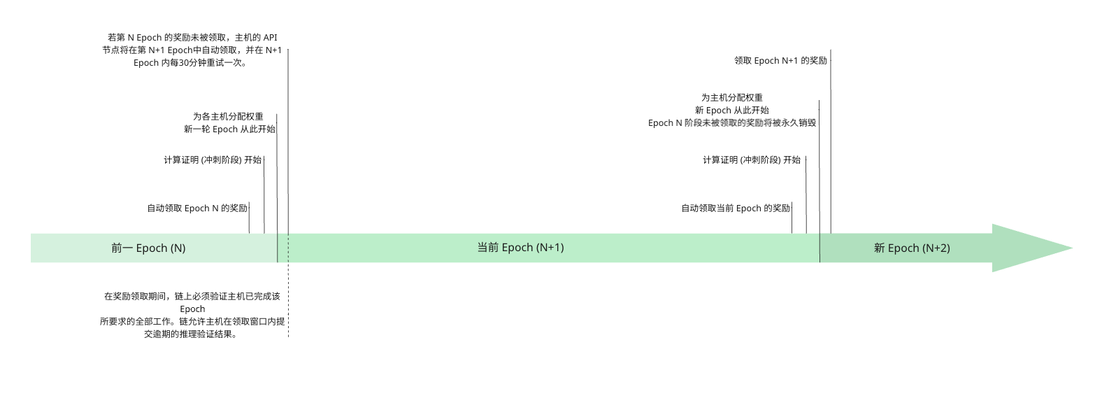 一个周期以自动申领周期 N 的奖励结束。新的计算证明阶段(Sprint)开始确定即将到来的周期的主机权重。一旦 Sprint 完成并分配了权重,这标志着新周期的开始。