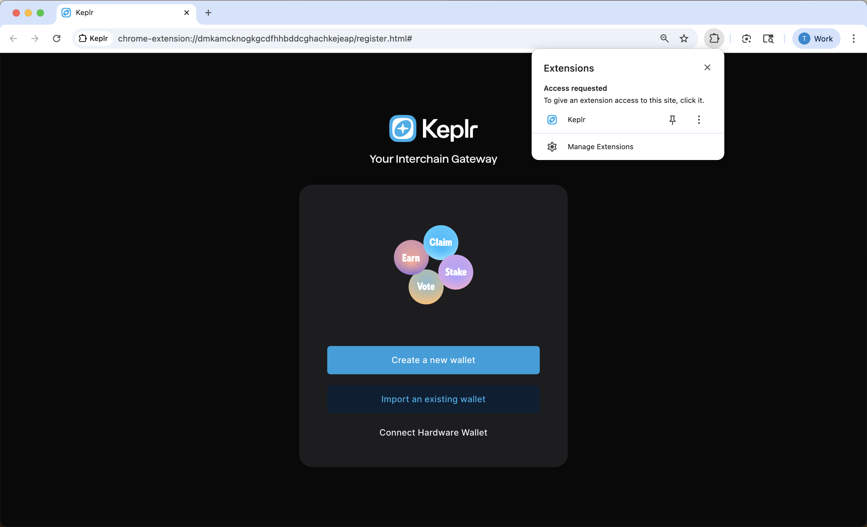 - 如果你已安装 Keplr 或 Leap 钱包浏览器扩展,请继续阅读"连接钱包"部分。